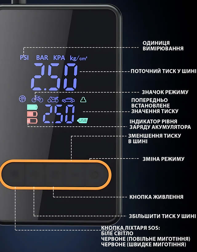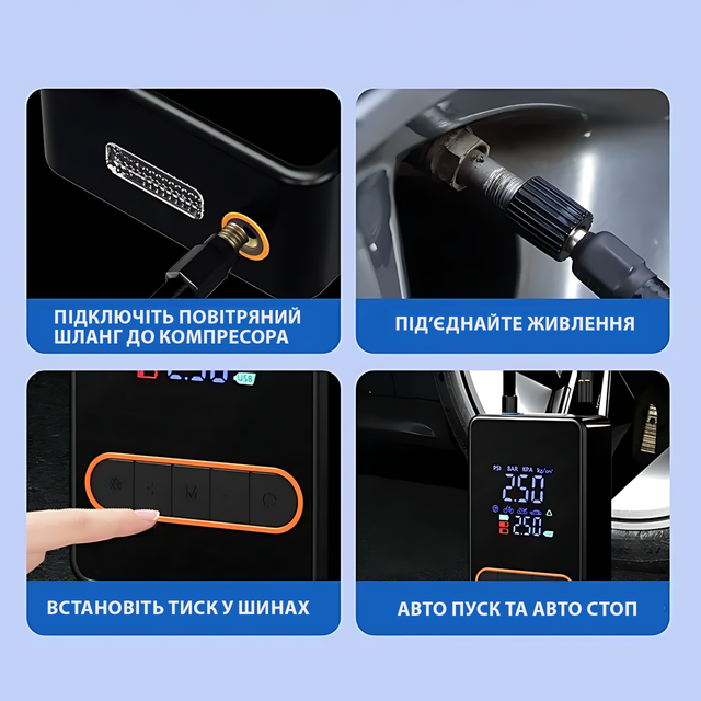 - Универсальность 4-в-1: подходит для шин автомобилей, велосипедов, мотоциклов, надувных матрасов, мячей и другого спортивного инвентаря. Один насос — множество задач.