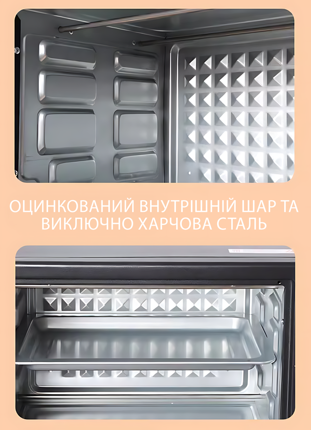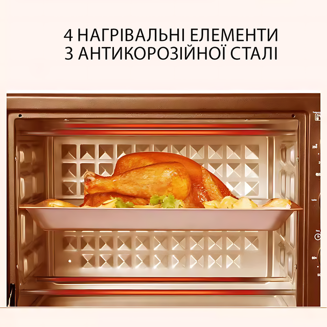 Объём 55 литров — в ней можно спокойно готовить на всю семью. А четыре нагревательных тэна (два сверху и два снизу) гарантируют равномерную прожарку без переворотов и танцев с бубном.