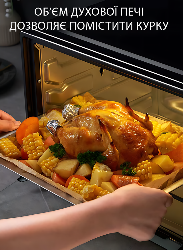 - Объём 55 л — поместится и пицца, и пирог, и целая курица