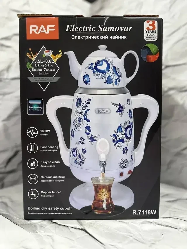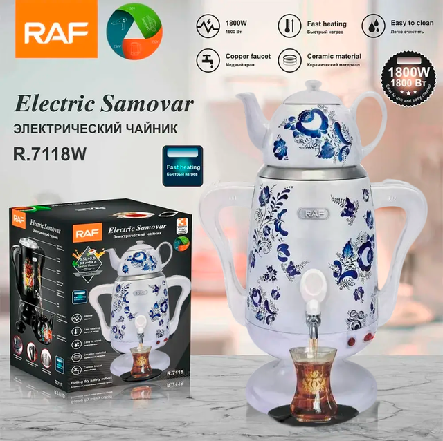Электрический самовар 2 в 1 RAF R.7118W - это изысканное и функциональное устройство для быстрого и комфортного кипячения воды. Благодаря ёмкому резервуару на 3,5 литра и встроенному фарфоровому заварнику на 0,6 литра, этот самовар идеально подходит для заваривания чая в любое время.