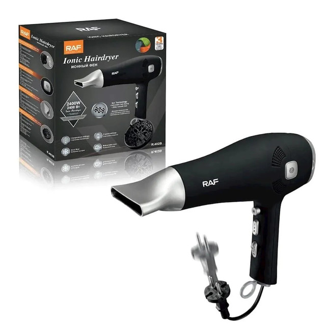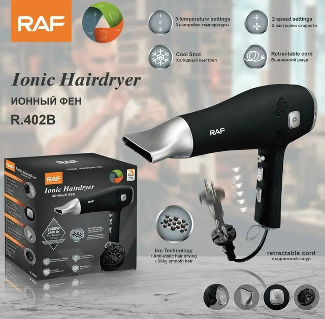 Ионный фен для волос RAF R-402B - это мощное и инновационное устройство, которое позволит вам полностью контролировать свою прическу и придать волосам здоровый и блестящий вид.