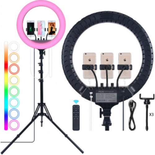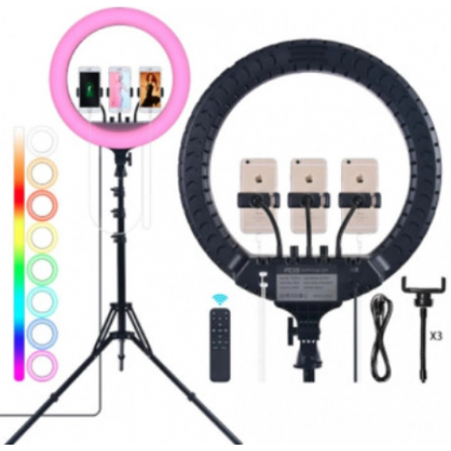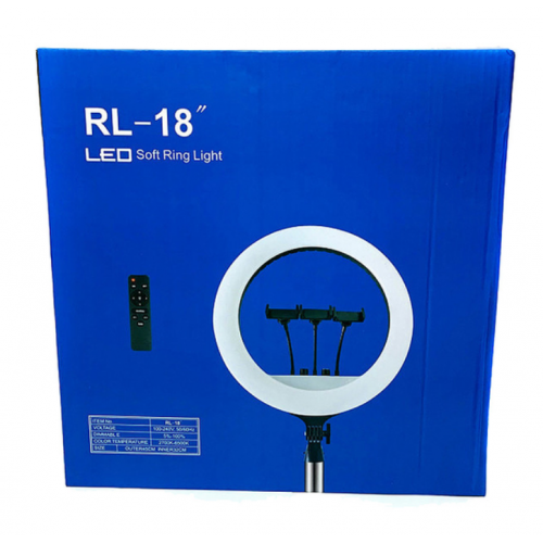 Кольцевая лампа RL-18RGB — это профессиональный источник освещения для фото, видео, блогов и макияжа. Благодаря диаметру 18 дюймов и регулируемой яркости и цвету (RGB) вы можете создавать идеальное освещение для любых условий. Плавная настройка температуры и оттенков позволяет менять атмосферу — от тёплого и холодного до цветного света.