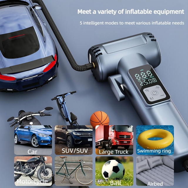 Устройство оснащено ярким цифровым дисплеем, который позволяет точно контролировать давление. После достижения заданного значения компрессор автоматически выключается, предотвращая перекачку. Модель поддерживает питание от прикуривателя 12 В и имеет встроенный Powerbank, что позволяет заряжать смартфоны и гаджеты через USB-порт.