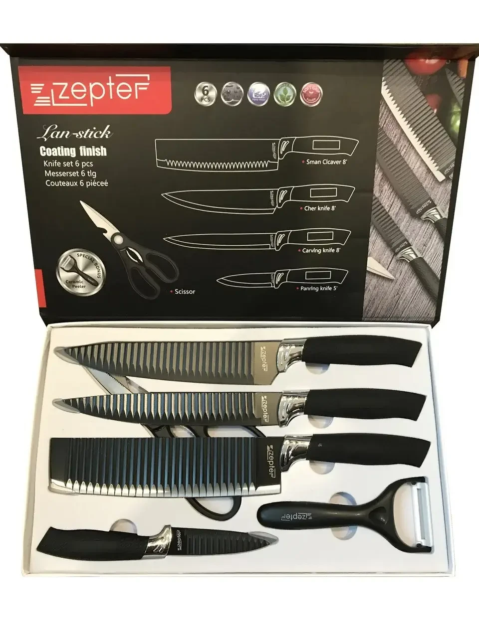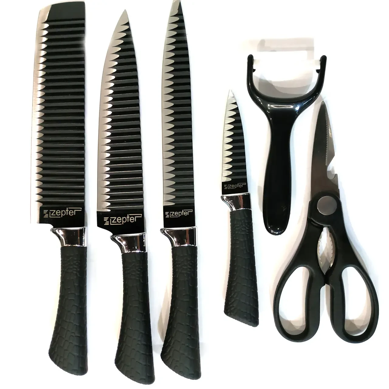 Хотите стать обладателем по-настоящему удобных и многофункциональных ножей, которые бы еще и выглядели невероятно стильно, тогда вам просто необходим набор ZEPTER ZP-007. Все ножи из этого набора имеют специальную ребристую поверхность с антибактериальным покрытием. В набор также входит овощечистка и кухонные ножницы.