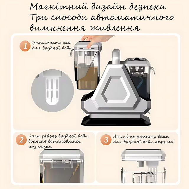 Два бака (1900 мл для чистой воды и 1200 мл для грязной) — чистишь дольше, отдыхаешь чаще.