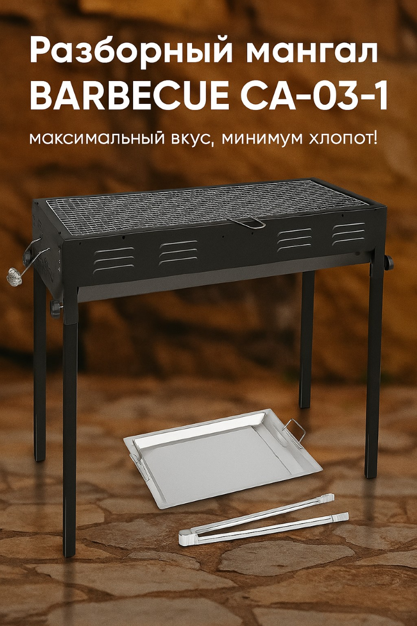 Погрузитесь в мир ароматного шашлыка и сочных стейков с мангалом BARBECUE CA-03-1 — это идеальный выбор для тех, кто ценит удобство, мобильность и вкус настоящего барбекю. Удобный, компактный и полностью укомплектованный, он легко поместится в багажник автомобиля и будет готов к использованию всего за пару минут — где бы вы ни были: на даче, в лесу, на пляже или в кемпинге.